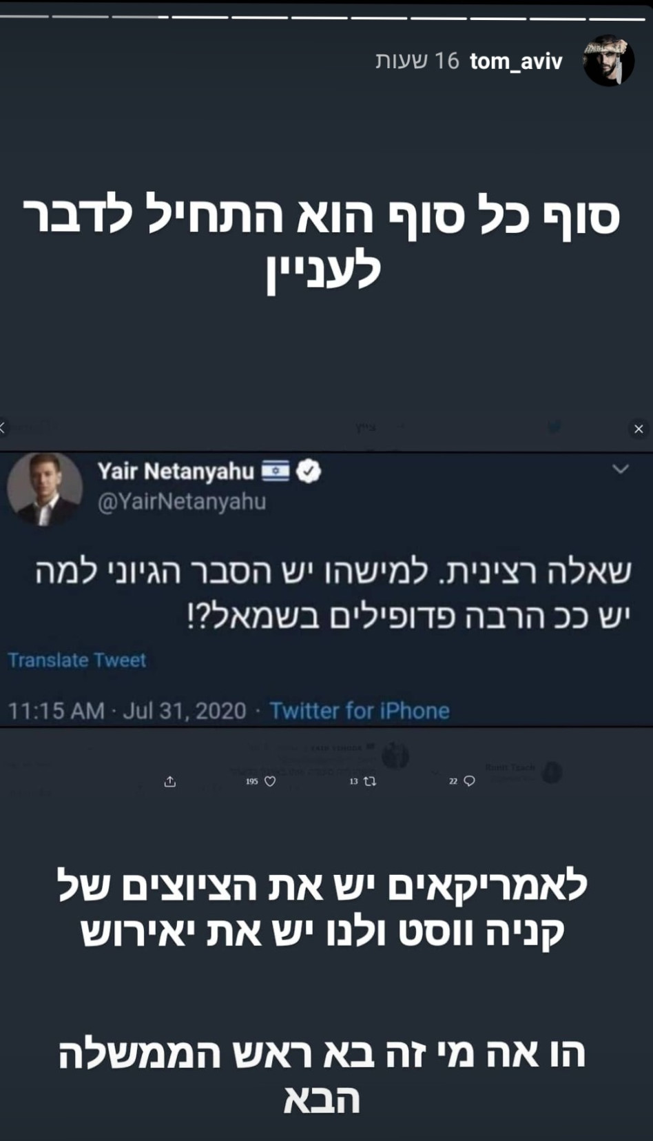 נתניהו וגנץ לא מסוגלים לקבל את ההחלטה הנכונה על עזה. הילד הזה הוא בעייתי והוא עושה לו נזקים. מה מצפים מילד שכל הזמן פוגעים בהורים שלו, שלא יגן על ההורים שלו? לאחר מכן הצטרף למפלגת הליכוד והיה חבר הכנסת השתים עשרה וסגן שר החוץ. בעניין יאיר נתניהו נחצו קווים אדומים.